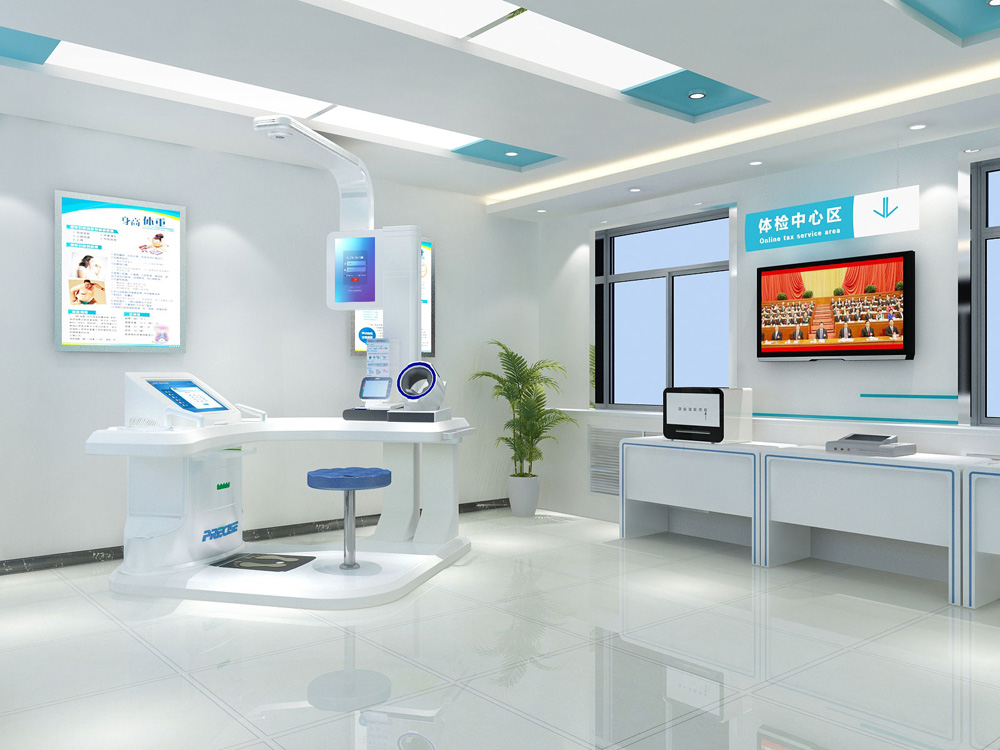 1、整體轉(zhuǎn)角式、流暢式設(shè)計(jì),醫(yī)療科技感十足,便于體檢者一次性自助式完成各項(xiàng)體檢項(xiàng)目。